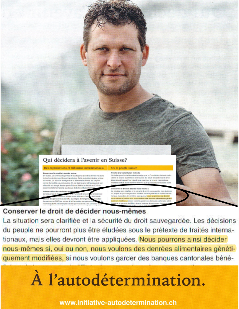 La régulation des OGM en Suisse n’a jamais été décidée par des juges étrangers, au contraire de ce qui est suggéré dans le tout-ménage envoyé par le comité de l’initiative contre l’interférence des juges étrangers dans le droit suisse (initiative contre le droit international). Le moratoire sur les OGM en vigueur en Suisse depuis 2005 est une solution inédite en Europe, décidée par la majorité des parlementaires suisses qui ont su écouter la voix de la population. La prolongation du moratoire jusqu’en 2021 a encore été soutenue par une majorité de parlementaires en 2017. Le message envoyé par le comité d’initiative contre le droit international est donc trompeur.